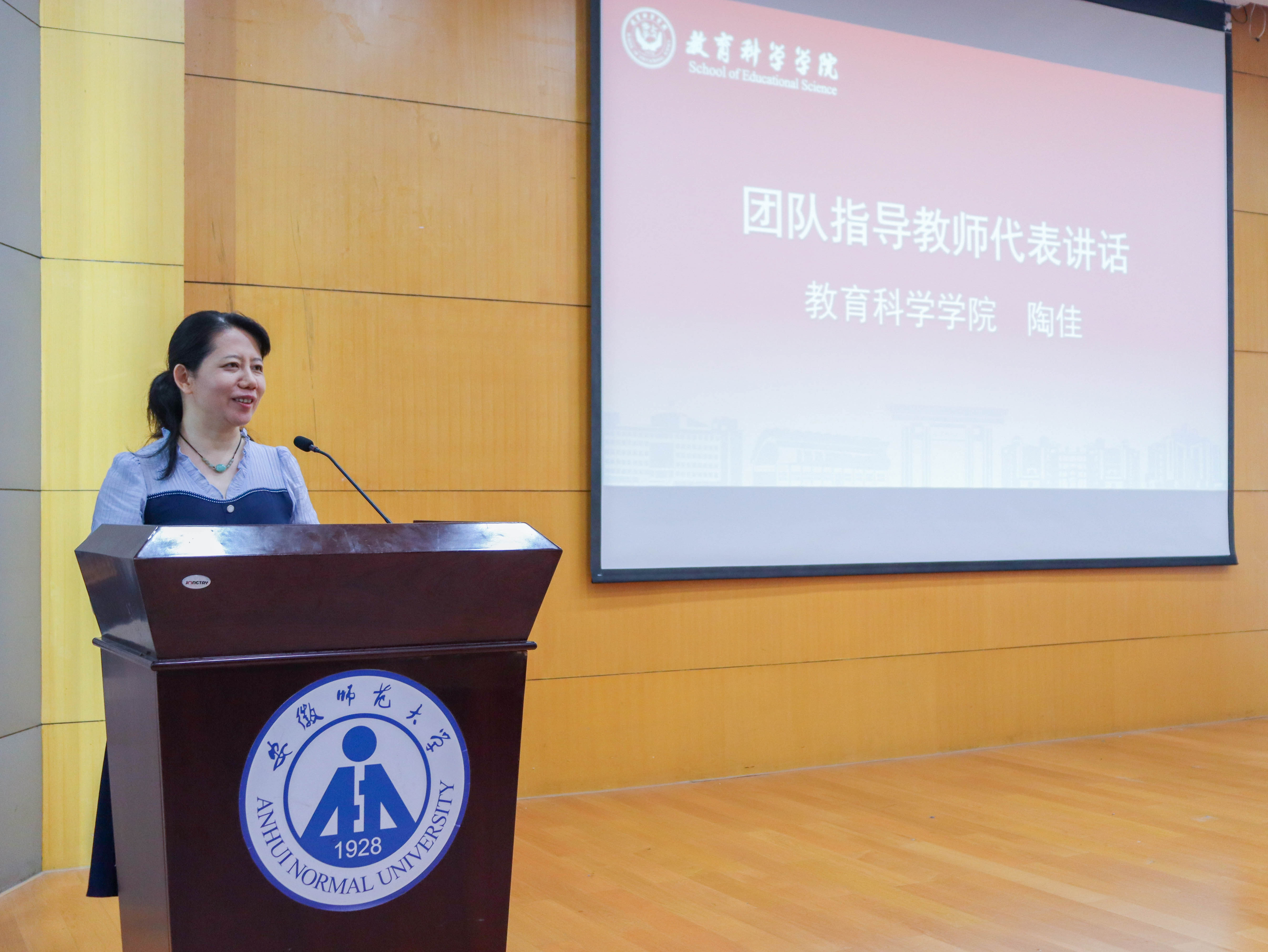 陶佳作为指导教师代表进行分享。暑期实践是将理论转化为实践智慧的舞台。她希望同学带责任实践,以师范生身份传递教育温暖;带问题实践,用技术精准对接理论与需求;带安全实践,做好人身、财产等安全预案。最后祝福同学在实践中受教育、长才干,做贡献。