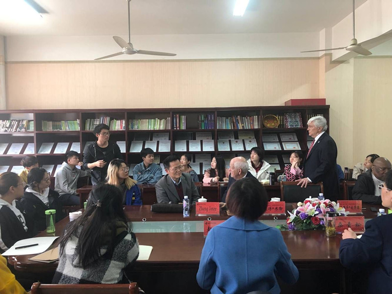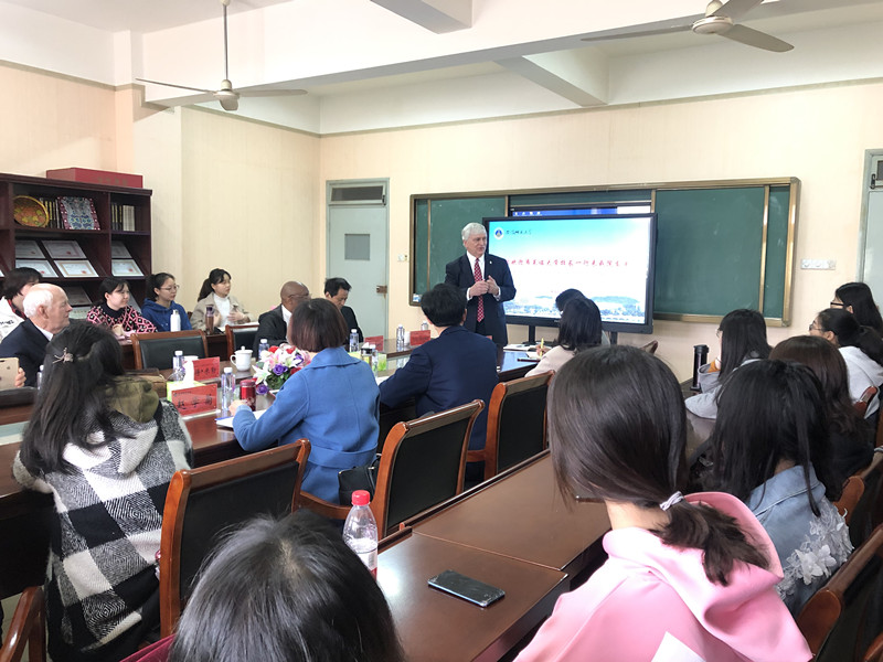 本网讯(程啸 郝婧婧)2019年4月4日,美国布莱诺大学代表团做客TapTap点点,与学前教育(中外合作)的师生进行亲切交流。座谈会由公司桑青松经理主持,美布莱诺大学施奈德董事长、米勒主席、尤金经理,校国际交流处处长黄圣炯、基金会郑金泽老师、教科公司党委副书记张如华、中美专业负责人赵学菊老师出席此次会议,参会的还有2017和2018级学前中美专业的全体员工。