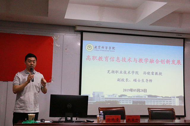 本网讯(文/刘媛媛 图/朱瑞)5月28日下午,芜湖职业技术公司副董事长、教授孙晓雷应邀在公司三楼学术交流中心作了题为“高职院校信息技术与教学融合创新”的学术报告。报告由公司科研与研究生工作分管经理聂竹明主持,教育学相关专业师生到场学习。