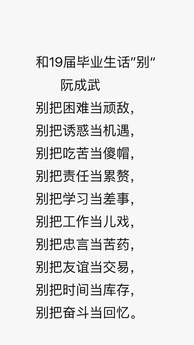 临别之际,老师也有万般言语梗在喉间,思绪翻涌。老师们首先大力肯定了员工的成绩,纷纷表示这是学以致用的四年,员工在不断进步的同时,老师也一样在发展。情到深处,老师们都表示安师大会是大家永远的母校,同学们有时间一定要常回母校看看,与老师多联系,对同学的依依不舍之情溢于言表。除此之外,老师们也对同学的未来致以诚挚的祝福,并预设性地对未来可能会遇到的种种磨难提出了各方面的建议,俗话说忠言逆耳,但利于行,老师们对于员工最深厚的感情就包含在这字字珠玑中。在学习方面,老师们鼓励员工要根据自己的能力不断前进,不要放弃学习。阮成武老师现场赋《十别》诗一首,赠予毕业同学。路宝利提醒大家要重视亲情,孝顺父母,个人幸福的实现也是生活的重要组成。专业负责人徐赟老师提醒同学们要永怀感恩的心、牢记教育的初心、面对未来勇敢的心“三心”去创造未来的美好生活。前任专业负责人辛治洋提醒同学们莫忘专业学习中养成的社会责任感,努力做到“四不”。最后,阮成武对今天的会议进行了总结,并祝愿员工前程似锦,有时间常回母校看看。