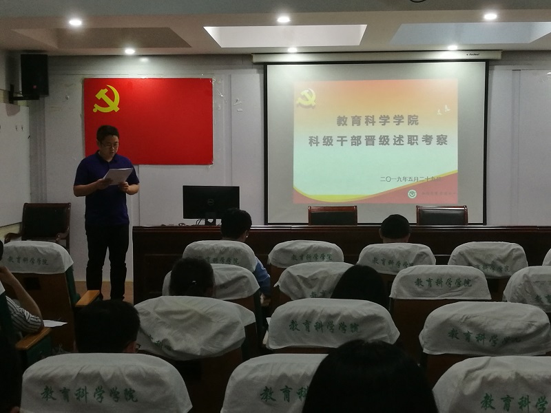 方泓对本次科级干部晋级考察的基本情况作出介绍并提出相关要求。莫大贡作为新晋级科级干部在会上做述职报告,重点总结履行岗位职责及主要工作完成情况。述职结束后与会人员进行民主测评,会议结束后在一定范围内进行谈话了解。