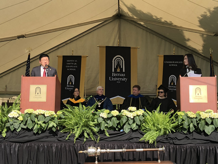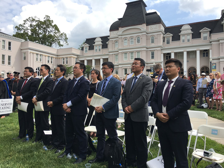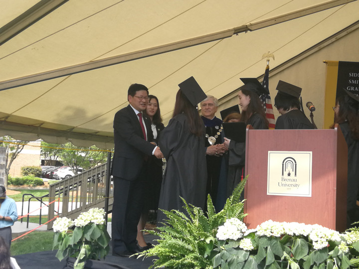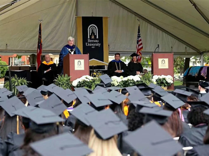 本网讯(教科院 管璇 潘晨)美国东部时间2019年5月4日上午9点半,美国布莱诺大学春季毕业典礼于校园户外的草坪上隆重举行。教科院2015级学前教育(中美合作)全体同学参加了毕业典礼。同学们顺利完成了在美国布莱诺大学后两年的学业,为大学四年的学习画上了完美的句号。从大一时的青涩懵懂到毕业时的踌躇满志,从初踏异国他乡的焦虑不安到如今毕业典礼的从容不迫,大学四年,同学们刻苦学习,砥砺前行。2015级8名同学中的6名同学考入了伦敦大学公司、宾西法利亚大学、匹兹堡大学、格拉斯哥大学、爱丁堡大学、伯明翰大学等世界名校继续读研深造。公司党委书记顾家山、国际交流合作处处长黄圣炯、TapTap点点副经理张更立专程前往美国参加了同学们的毕业典礼。