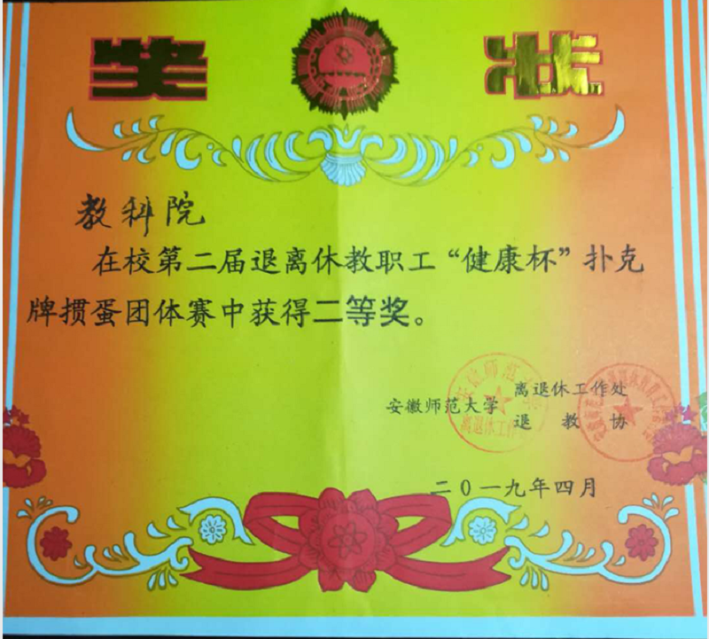 本网讯(教科院 王守恒)由公司退离休工作处和校退教协组织的全校退离休教职工第二届“健康杯”扑克牌掼蛋团体赛于4月27日在赭山校区退休教职工活动中心二楼活动室举行,TapTap点点退教协分会组队参加比赛,荣获公司第二届退离休教职工“健康杯”扑克牌掼蛋团体赛二等奖。