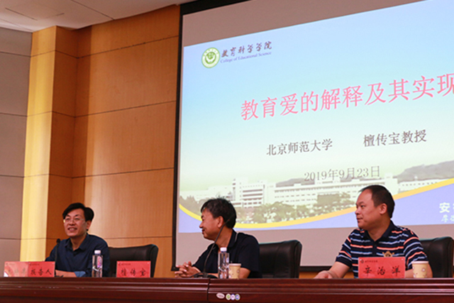 檀教授以诙谐有趣的故事引入讲座主题:教育爱的解释及其实现——孔夫子的“仁”与诺丁斯的“关怀”概念之比较。他从爱的核心内涵、爱的内在机制、爱的实践逻辑、爱的现实依据及爱的情感体验五个方面阐述了孔子和诺丁斯理念上的一致性。檀教授在总结两位教育家思想体系的基础上,得出了三点结论:第一,男性一样可以有女性的关怀思维,关怀这一“女性伦理”适用于所有人。第二,关系性思维不仅是关怀的具体建议,更是一种比较重要的方法论;第三,教育爱永远都是具体的,因材施教是最重要的教育原则。