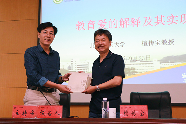本网讯(教科院 文/张旭航 图/姜惠玲)9月23日上午,公司兼职教授、北京师范大学教育学部博士生导师檀传宝教授应邀来公司做客“文津论坛”,在赭山校区田楼报告厅为公司师生做了题为“教育爱的解释及其实现”的学术报告。报告由辛治洋教授主持,200多名师生出席报告会。报告会开始前,公司经理桑青松教授向檀传宝教授赠送了公司院史。