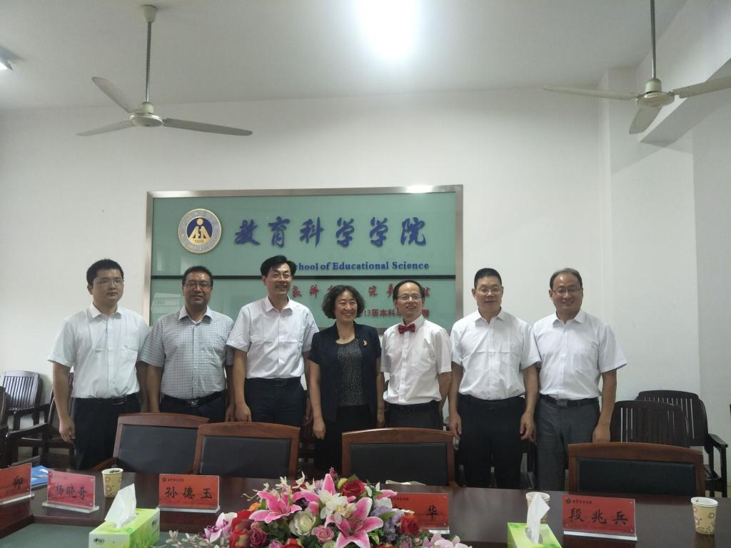 座谈会结束后,郭华教授与教科院的桑青松经理及其他老师们共同留影纪念。名师工作室专家段兆兵教授、杨晓奇教授、吴支奎副教授、李卯副教授以及课程与教学论专业所有研究生参加了此次座谈。
