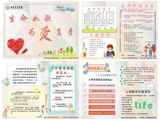 为进一步普及心理健康教育知识,拉近员工对生命教育的距离感,公司发展辅导站联合院员工会宣传部和老员工心理研究会,精心设计主题为《生命如歌 为爱负责》展板,放置于校院橱窗内,向来往师生提供内容丰富、深入浅出的专题宣传。其中,既有来自文学作品和影视歌曲中激人向上的语句,也有来自身边同学匿名的暖心留言,还包含来自书本理论的谆谆教导。层层衔接、环环相扣,让来往员工总能在某个句子中找到触动自己的内容。
