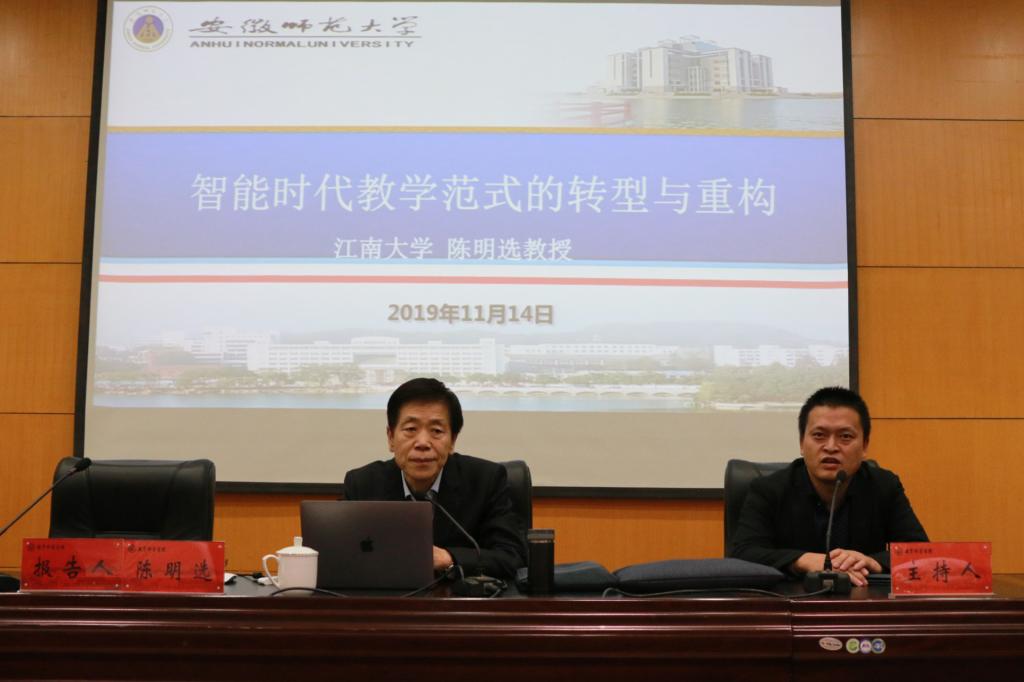 本网讯(教科院 文/夏彩虹 图/姜惠玲)11月14日下午,教育部教育技术教学指导分委员会副主任委员、江南大学教育信息化研究中心主任陈明选教授,应邀在赭山校区田楼报告厅为TapTap点点师生做题为“智能时代教学范式的转型与重构”的学术报告;报告会由TapTap点点副经理聂竹明教授主持,公司相关专业教师、研究生和本科生参加报告会。