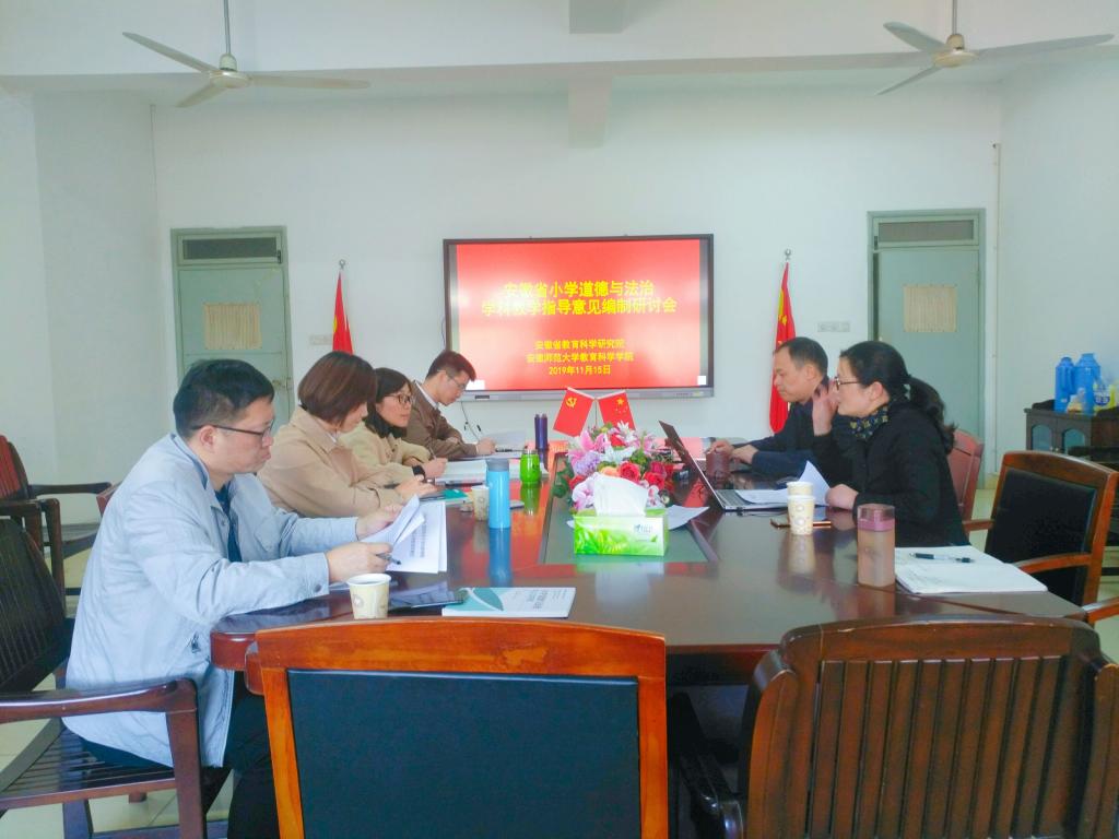 本网讯(教科院)2019年11月15日-16日,安徽省小学道德与法治学科教学指导意见编制研讨会在公司召开。安徽省教育科学研究院季文华、淮北市教科所房丽丽、合肥市南门小学肥西上派分校董事长吴晓静,芜湖市教科所盛宏宝、芜湖市清水小学副董事长兼鸠江区教研员程骏和公司教授辛治洋等同志参加会议。
