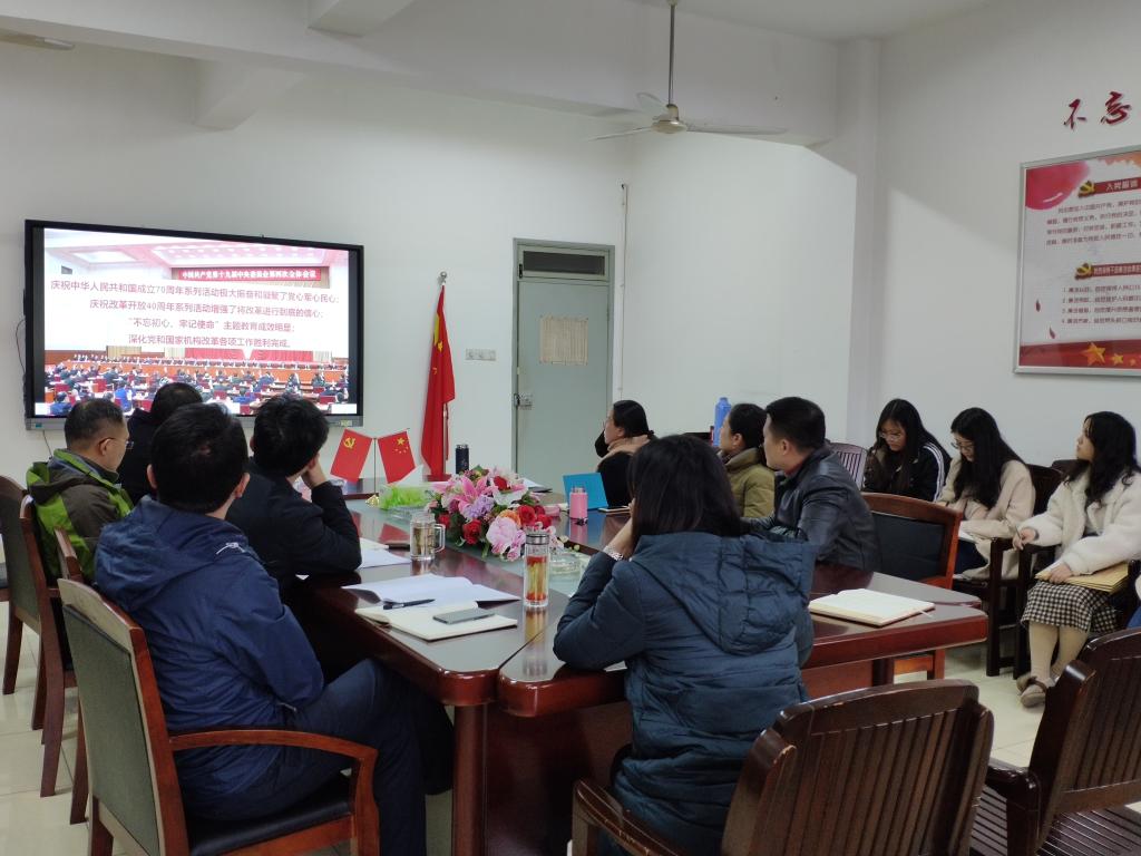 会上,方泓传达了关于认真学习贯彻党的十九届四中全会精神的通知,他指出党的十九届四中全会是在中华人民共和国成立70周年、中华民族伟大复兴关键时期召开的一次重要会议,具有重大而深远的意义;他强调,深入学习贯彻落实党的十九届四中全会精神是当前和今后一段时间里的重大政治任务,要切实加强组织领导,将深入学习贯彻党的十九届四中全会精神与主题教育工作紧密结合起来,在全院师生中掀起学习热潮,推动党的十九届四中全会精神入心入脑,武装思想,推动工作。副经理聂竹明以PPT形式领学了《中国共产党十九届四中全会会议公报》,他从一个重磅文件、一系列重大活动评价、一个重要判断、制度优势:十三个“坚持”、一个总体目标、未来部署:十三个“坚持和完善”等六个方面对公报内容进行了全方位的解读。副书记张如华领学了公报中关于如何理解“中国之治”的理论文章,她表示要清晰了解我国国家制度和治理体系所要达到的水平和层次,加深理解坚持和完善中国特色社会主义制度、推进国家治理体系和治理能力现代化的重大意义。