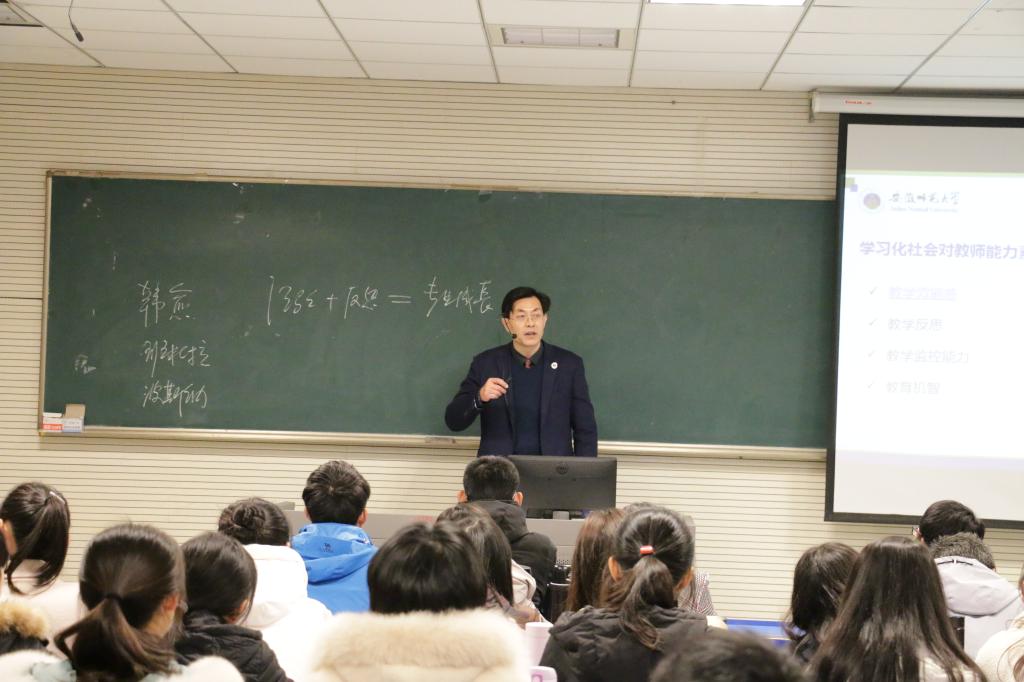 桑青松教授讲授的内容为2019级心理学专业基础课《普通心理学》课程中“青少年心理教育”这一主题。在课堂导入阶段,桑老师让同学们思考什么是好教师,并从教师心理健康的回顾与反思,教师教育与教师专业化发展,以及员工心目中的好老师等方面阐述教师心理健康。接下来,桑老师从员工学习心理的内涵、特点和规律,学习品质培养的逻辑与理据,学习心理优化等,运用生动的案例和实验逐步展开教学,内容安排循序渐进,课件制作精美,讲解深入浅出,使员工们对“学习心理”有了更全面的认识和更深刻的“体验”。在整个教学过程中,桑老师教态稳重、亲和、大方,与员工的互动形式多样,并且注重联系生活实际和本领域前沿研究成果,这都充分展示了他深厚的教学和学术功底。