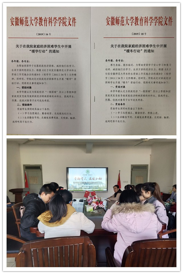 本学年公司继承往年传统继续开展了“暖春”、“暖途”、“暖学”、“暖冬”系列暖工程,并将“暖学行动”与“暖冬行动”作为本学期员工资助工作的重点,力求精准、快捷地资助家庭贫困员工,解决他们的实际问题。本学期暖工程重点对象为前期受资助相对较少的贫困生及经济特别困难和家庭近期遭受变故的员工,任务部署后公司各年级辅导员仔细摸底,认真筛选,有针对性地对他们进行资助,切实做到应助尽助。在近期开展的“暖冬”行动中,公司改革往年发放实物的传统,实现“暖冬”全覆盖,将补助发放给每位贫困生,供他们自由支配以便用在自己最需要的地方,并召开暖冬行动慰问座谈会,在寒冷的冬季送去温暖。