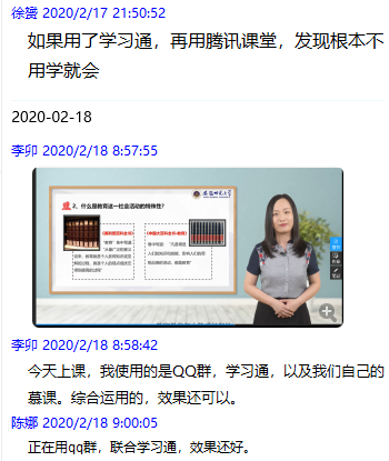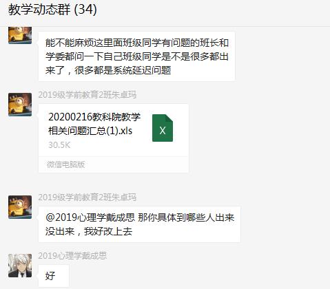 教学监控网络化全覆盖,全面收集教学中出现的问题及时进行反馈。一是教学办组建了由各班班长参加的微信群,同学们可以在群里反映各课程的线上授课准备情况、授课过程中出现的问题等,由教学办汇总进行研判,分头交给教务处和超星技术人员处理。二是通过各专业负责人了解各专业教师的授课情况、教学建议等,及时处理并反馈,确保线上教学工作顺利进行。另外,公司将于近期针对个别技术困难教师开展线上授课的技术辅导工作。三是严格教学微信群、QQ群的管理,落实群主管理责任,邀请辅导员入群协助管理,严格核实所有成员身份,严格落实实名制度,严格入群批准验证,杜绝陌生人随意入群现象。