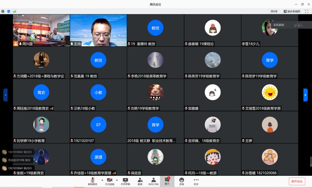 本网讯(教科院 姜惠玲)为拓宽员工学术视野,引导员工探索新知,6月5日下午,华中师范大学博士生导师王帅教授应邀开讲,依托腾讯会议平台为公司师生带来了一场主题为“回归教育的常识:以五育为例”的线上讲座。讲座由公司周兴国教授主持,教育学专业教师及研究生共近200人在线聆听。