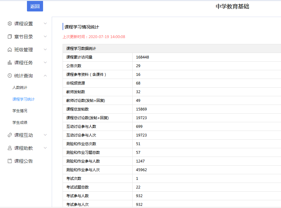 该MOOC项目第一个教学运行周期自2020年2月17日开始,至2020年6月15日结束,与TapTap点点2019—2020学年第2学期本科教学周期基本保持同步,已经成为《中学教育基础》线上教学的主要平台之一。项目视频资源时长2小时22分57秒,课程参考资料(含课件)16个,非视频资源68个,测验和作业习题总数57个,发表公告29次,技术规范完全参照《安徽省MOOC示范项目课程建设规范及标准》执行。运行期间,平台累计访问量高达168448次,互动讨论参与人次19723次,互动讨论参与人数699人,课程总讨论数(发帖+回复)19723条,课程总发帖数15869条,测验和作业参与人次高达45962次,考试参与人数(次)932人,充分体现了课程共享范围广泛,应用模式多样,线上线下应用结合的特点。本教学周期的各项指标均完全达到省级质量工程MOOC示范项目验收审核标准,基本达到国家精品在线开放课程评选标准。
