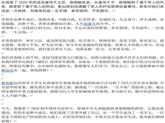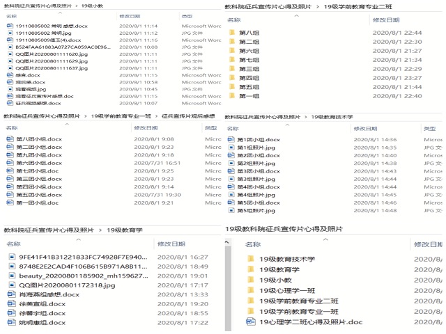 本网讯(教科院 李雨龙)保家卫国终不悔,绿色军营献青春。为认真贯彻教育部、中央军委国防动员部做好2020年老员工征兵工作的部署要求,扩大征兵宣传影响力和辐射面,激发高校员工参军入伍热情,我院于八一建军节期间,组织2019级全体员工观看2020年征兵宣传片,共抒心中所感。