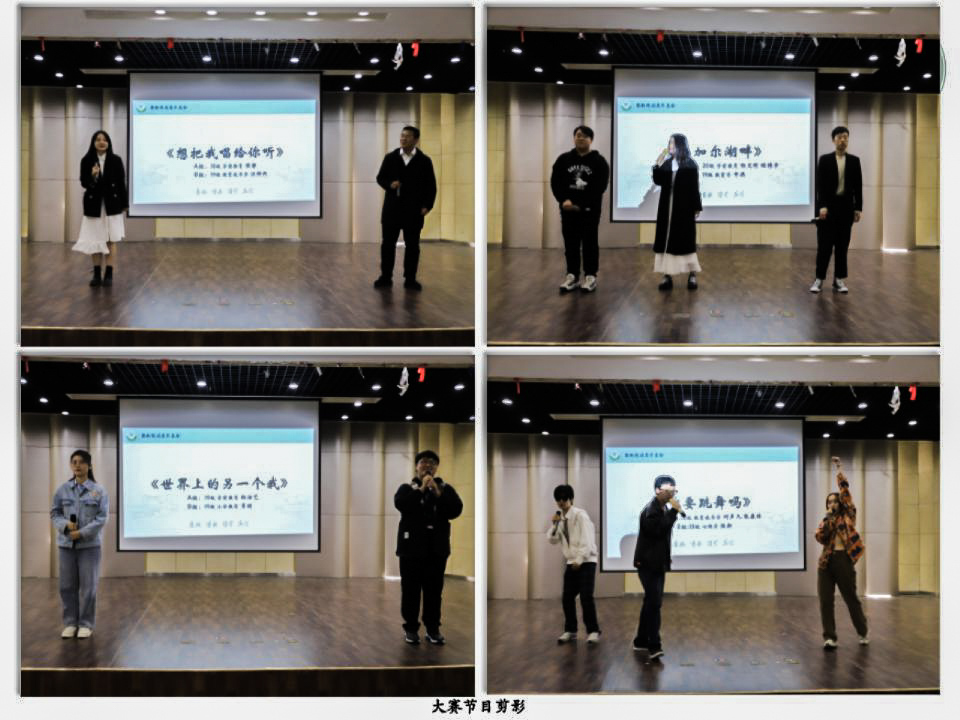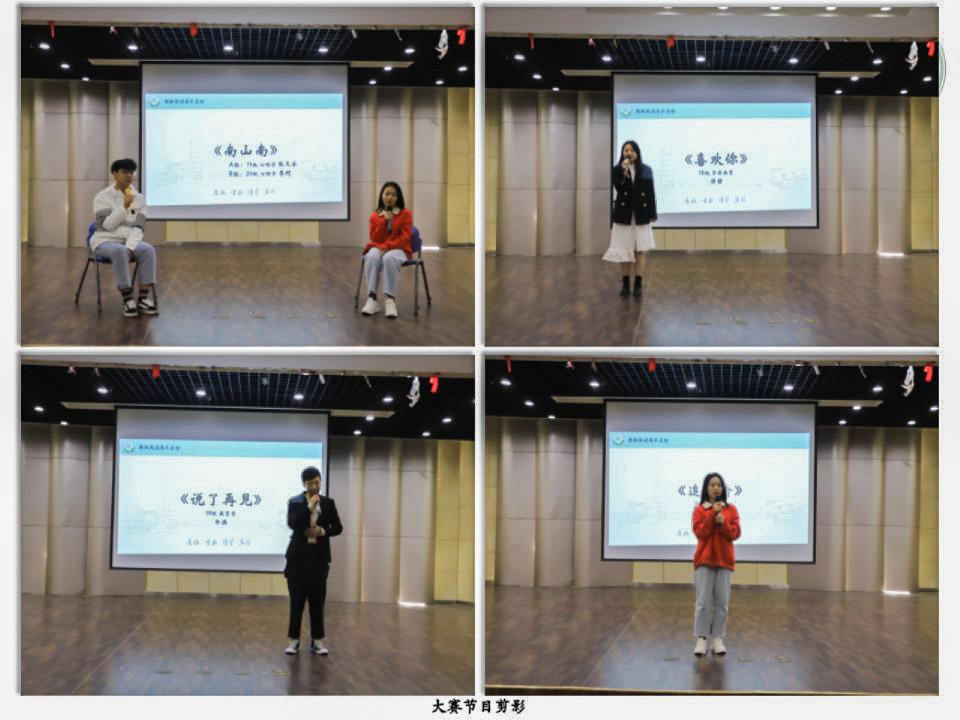 歌声飞扬,尽展芳华。大赛上,有清新恬淡的《想把我唱给你听》、《世界上另一个我》,有曲调悠扬的《贝加尔湖畔》、《南山南》,有热烈欢快的《一起跳舞吗》,有饱含期愿的《喜欢你》、《追光者》,有致敬经典的《千里之外》、《你是人间四月天》,有歌声婉转的《说了再见》、《阿楚姑娘》。所有同学们演唱结束后,院团委书记程啸老师为同学们带来了一首歌声空灵的《水星记》。一首首美妙的歌曲,一个个精彩的演唱,让同学们沉浸其中,享受了一段听觉盛宴。