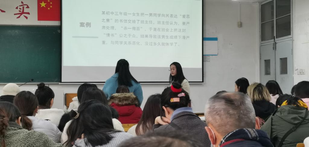 道德可教,怎么教,有无规律可循?滕曼曼老师以一案例为导,引领员工展开了一场“德育过程基本规律”的探寻之旅。寻旅之初,滕老师借着对教育和品德概念的再分析,道出“德育过程就是个体道德社会化和社会道德个体化的统一过程”这一内涵,并且指出这一概念启示我们在进行德育时,既要意识到德育是师生双向互动的过程也要注意以生为本、因材施教。在此基础上,滕老师又设置了“员工作弊教师如何处理”的问题情境,通过与员工交流互动、共同解析问题情境的方式,层层抽丝、环环剖析,直至员工领悟德育过程的基本规律。最后,滕老师还设计了“同学作弊你如何处理”的思考作业,提高员工运用理论解决实际问题的能力。