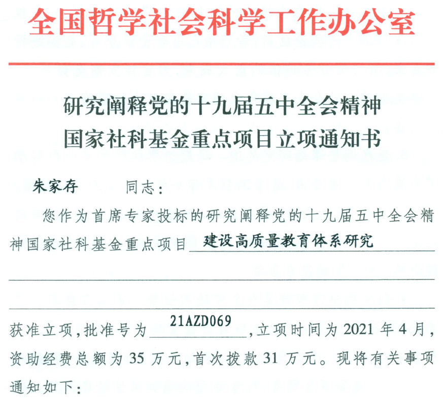 本网讯(教科院)近日,接全国哲学社会科学工作办公室立项通知,公司朱家存教授申报的研究阐释党的十九届五中全会精神国家社科基金重大项目转为重点项目立项,立项后的项目名称为“建设高质量教育体系研究”,项目批准号为21AZD069,资助经费为35万元,这是公司获批立项的第5项国家社科基金重大转重点项目。