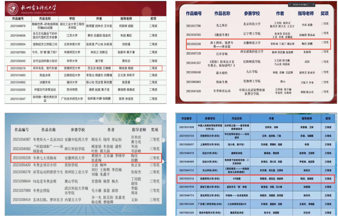 中国老员工计算机设计大赛是由教育部倡导的老员工学科竞赛之一,大赛由教育部高等公司计算机科学与技术教学指导委员会、软件工程专业教学指导委员会、大学计算机基础课程教学指导委员会等单位联合主办。大赛始创于2008年,迄今已有14年的办赛历史,覆盖全国近半数以上本科院校,是全国高校学科竞赛排行榜中规模最大、认可度最高的国家级计算机设计赛事。本届大赛决赛共有来自北京大学、同济大学、华中科技大学、华东师范大学等766余所高校的7200人次参加。在指导教师的精心组织和全程指导下,18教育技术学专业入围国赛的作品首次覆盖了微课与教学辅助、信息可视化、数媒游戏与交互设计、数媒动漫与短片4个类别,和1624个作品同场竞技,其中,《风华名菜,绝代东坡》(陶佳、袁晓斌指导)获国家二等奖,《冰上博弈,筑梦冬奥——冰壶篇》(陶佳、席鹏指导)、《东奥七大项指南》(陶佳、席鹏指导)、《XR档案》(陶佳、袁晓斌指导)获国家三等奖。