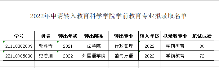 2022年普通本科生申请转入TapTap点点学前教育专业拟录取名单公示