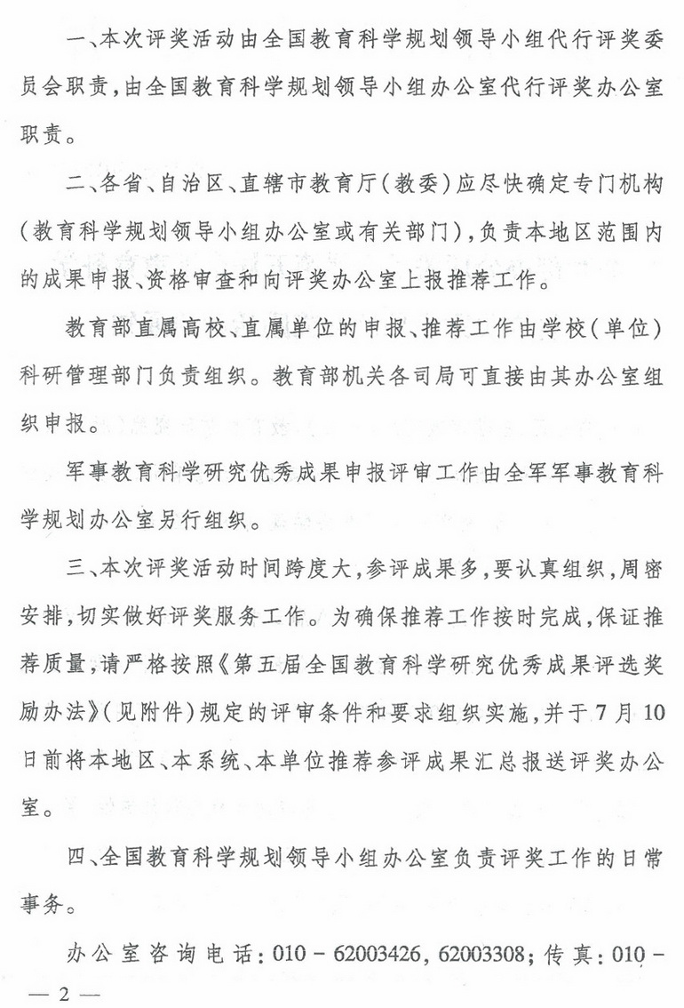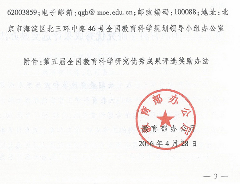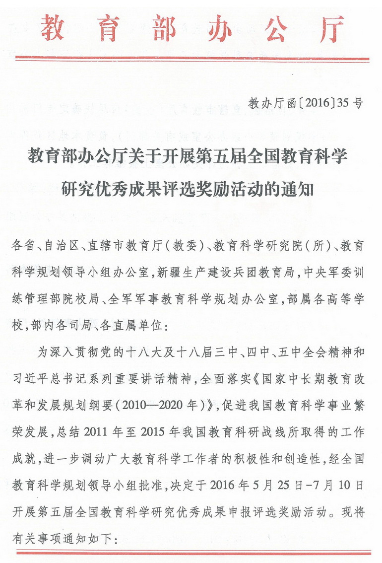 现将《教育部办公厅关于开展第五届全国教育科学研究优秀成果评选奖励活动的通知》(教办厅函[2016]35号)及《第五届全国教育科学研究优秀成果评选奖励办法》转发给你们,请按通知要求积极组织申报,由秘书于2016年6月10日前将申报材料汇总后报送至科研处。申报材料包括: