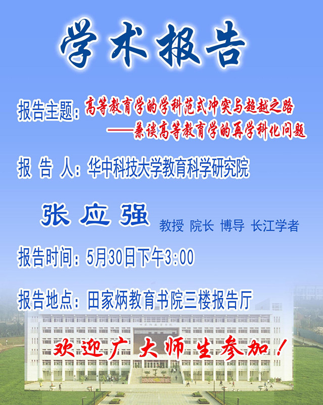 华中科技大学教育科学研究院经理博士生导师张应强教授学术报告预告