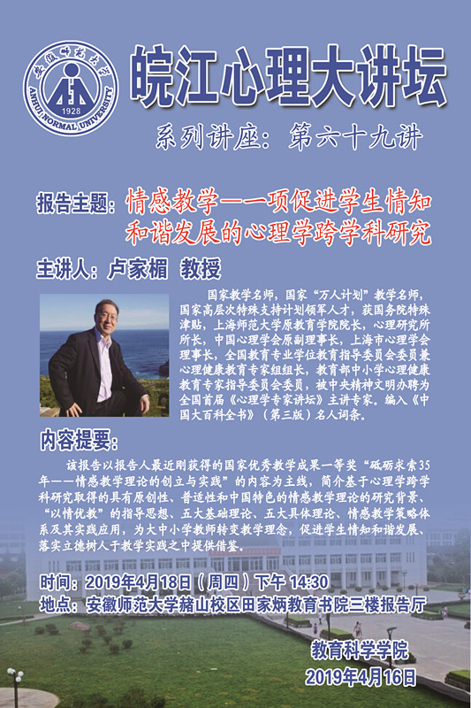 学术报告预告:皖江心理大讲坛第六十九讲——卢家楣:情感教学—一项促进员工情知和谐发展的心理学跨学科研究