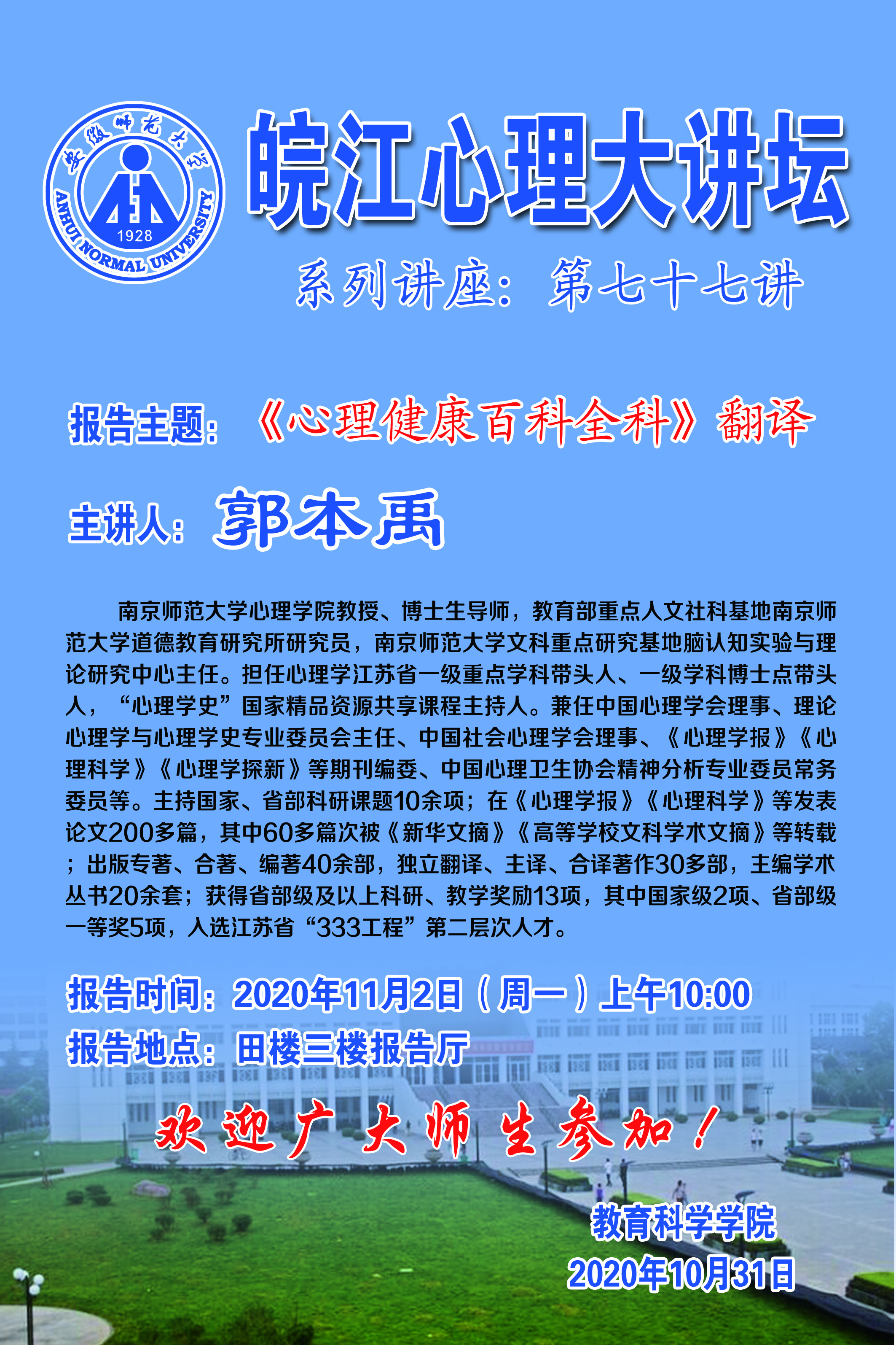 学术报告预告:郭本禹——《心理健康百科全科》翻译