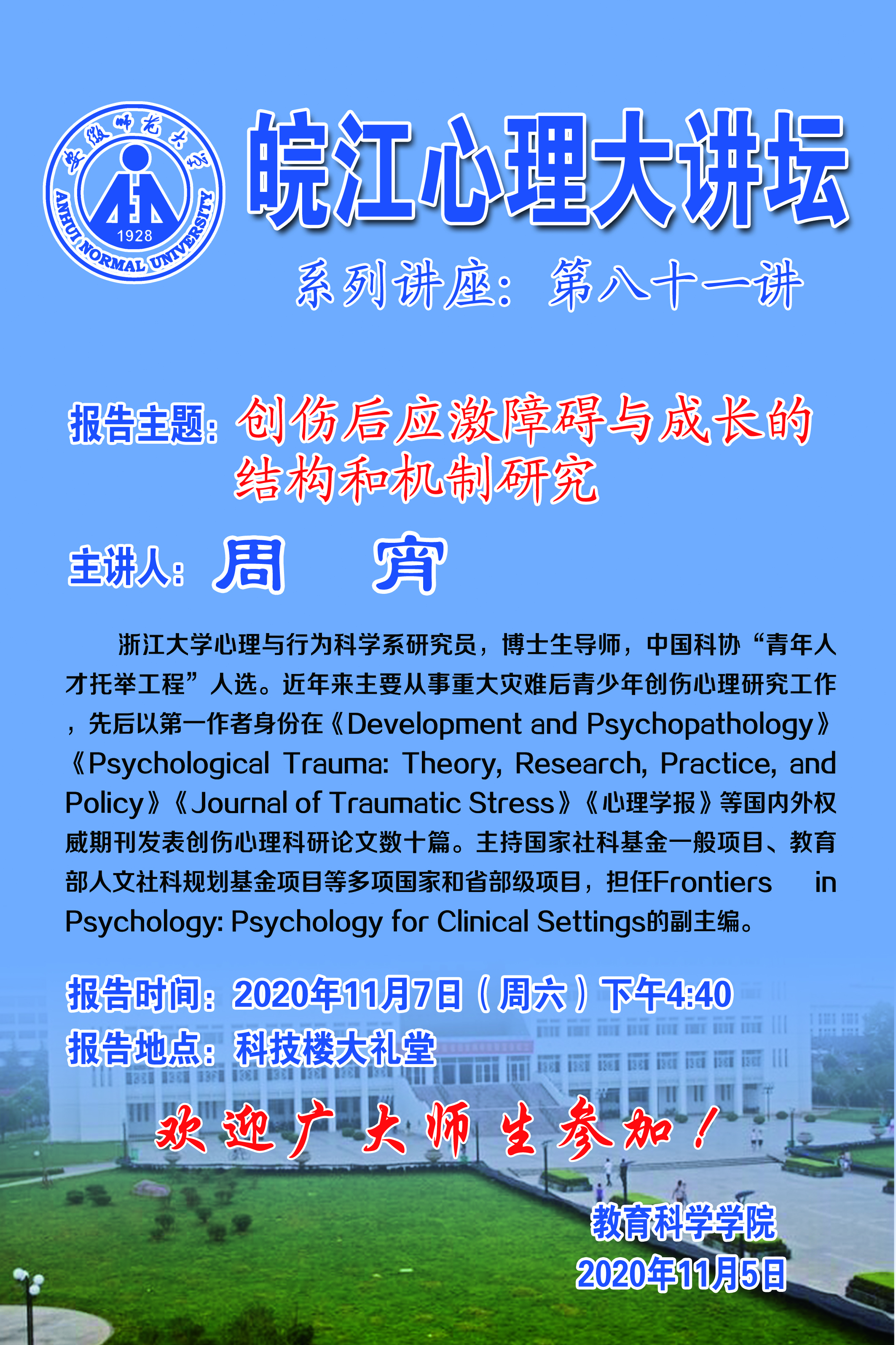 【学术预告】皖江心理大讲坛八十一讲:创伤后应激障碍与成长的结构和机制研究