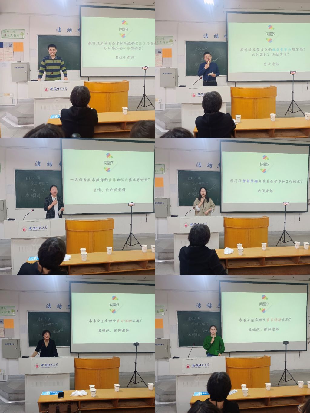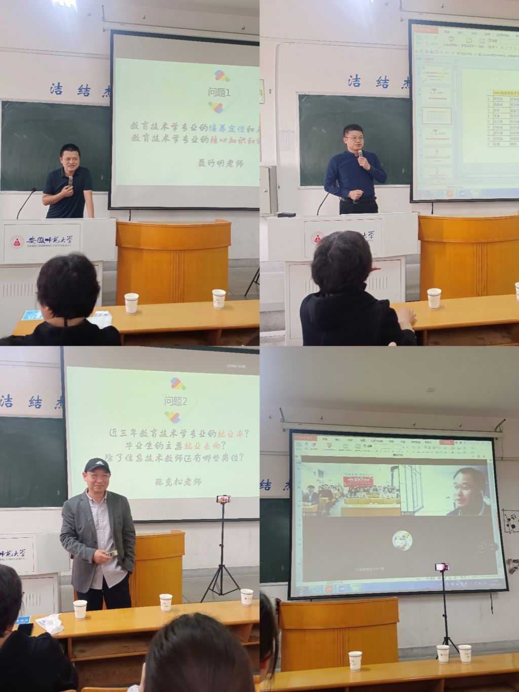 围绕“教育技术学专业的培养定位和未来发展趋势”“专业近年的就业去向和主要岗位”“专业考研的主要院校和方向”“专业就业的核心竞争力”“中学信息技术教师的素养与能力要求”“专业实习实践活动安排”等同学们关注的问题,参会教师结合专业举办历史、当前教育信息化、“人工智能+教育”发展趋势和往届同学的发展情况,为全体同学进行了详细的解答。