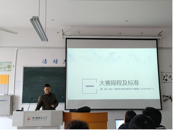 接下来,杨老师对师范生技能大赛的参赛对象、参赛分组及竞赛内容、以及奖项分配和竞赛流程做了详细的介绍。并对所要提交的文本材料和视音频资料的格式、大小等注意事项做了讲解。