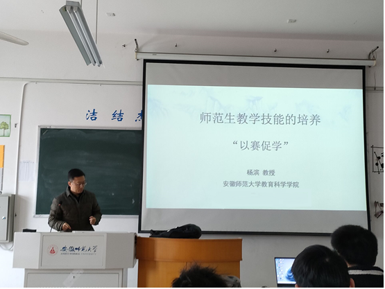 杨滨教授结合“师范生教学技能竞赛”的有关情况,从大赛规程及标准、师范生应该具备的教学技能、参赛的常见问题及建议等方面向同学们介绍了师范生应当具备的教学技能以及参加教学技能竞赛的相关要求。