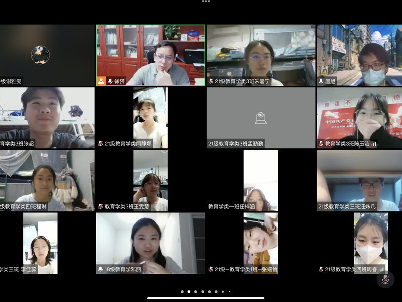 本网讯(教科院 文/图 谢雅雯)为进一步做好2021级教育学类的专业分流工作,加深同学们对教育学专业的理解,4月9日晚7点至9点,国家级一流本科专业建设点教育学专业以线上会议的形式,面向2021级教育学类全体本科生举办了教育学专业解读会。与前期专业人才培养方案解读暨宣讲答疑会不同,本次会议邀请了2021届教育学专业毕业生唐旭与2018级教育学专业本科生邓丽等两位同学,从员工视角为同学们解读专业。会议由教育学专业负责人徐赟老师主持。