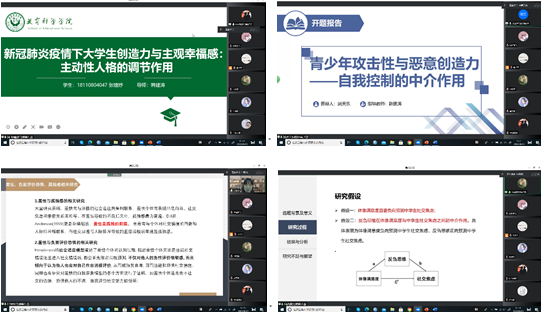 本网讯(教科院 程梦飞、陶芮])2022年4月23日下午,因疫情防控需要,2018级心理学(师范)专业第一轮毕业论文答辩以腾讯会议形式在云端如期举行。本次答辩分为4个小组共53位毕业生,18级指导老师共12位担任答辩评委,19、20和21级心理学本科生参与聆听答辩会。