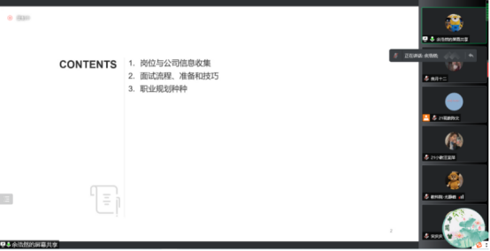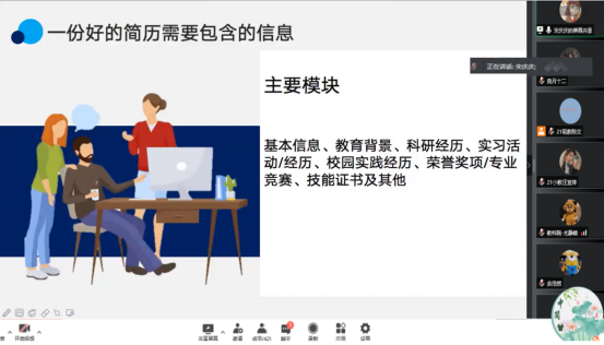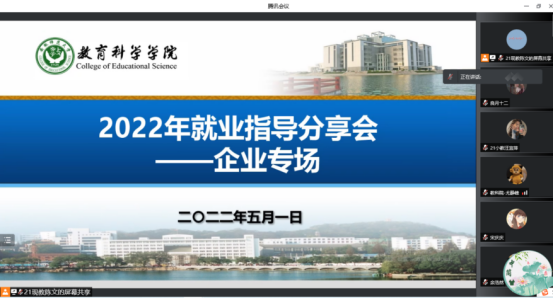 5月1日晚,学院通过腾讯会议平台针对2022届毕业生们开展了就业指导分享会——企业专场,研究生辅导员谭茹轩参加了此次分享会,40余名硕士研究生在线交流学习,此次分享会由院研究生会员工部成员尤静峰主持。