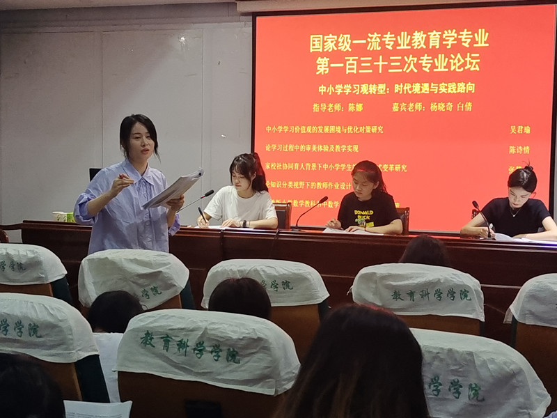 此次专业论坛吴君瑜小组围绕“中小学学习观转型:时代境遇与实践路向”的热点主题展开研究与探讨。第一位汇报人吴君瑜以《中小学学习价值观的发展困境与优化对策研究》为题,从学习价值观的静态结构与动态结构出发,指出其存在着核心价值取向的搁置、多元价值观取向的分裂、价值内容的浅层化问题,并提出相应优化对策。第二位汇报人陈诗情根据《论学习过程中的审美体验及教学实现》的主题展开汇报,从学习过程中审美体验的内涵与表征、价值意蕴、遮蔽与成因以及导向员工审美体验的教学展开四个方面进行研究。