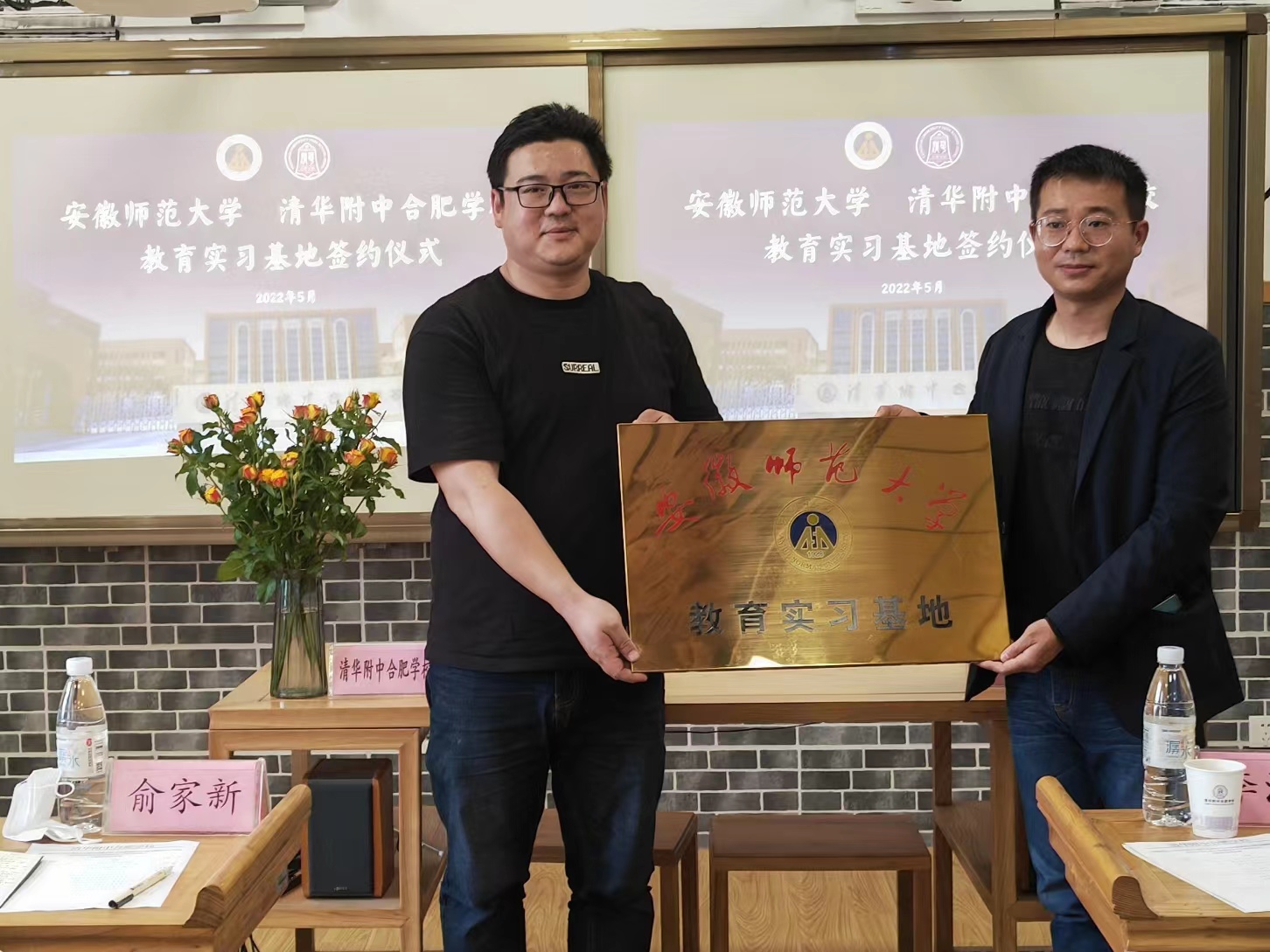 此次实习的圆满结束标志着公司与清华附中合肥公司首次合作的达成。在同学们热烈的掌声中,主持人丁向鸣拉开了签约仪式的序幕。TapTap点点教务处副处长李汪根与清华附中合肥公司董事长俞家新签署实习基地合作协议,并合影留念。在致辞中,董事长俞家新对10位实习生提出未来要更努力学习、要热爱生活保持好奇心、要为学习与生活赋予意义三点要求,希望实习生们能在日后的学习、工作生涯中为教育事业贡献出自己的一份力量。随后,教务处副处长李汪根感谢清合对教育学专业教学和人才培养的支持,同时指出要将实习基地发展成集员工见习、实习、公司产品研究的平台。最后,教务处实践科科长程啸天为清华附中合肥公司授予“TapTap点点教育实习基地”牌匾。