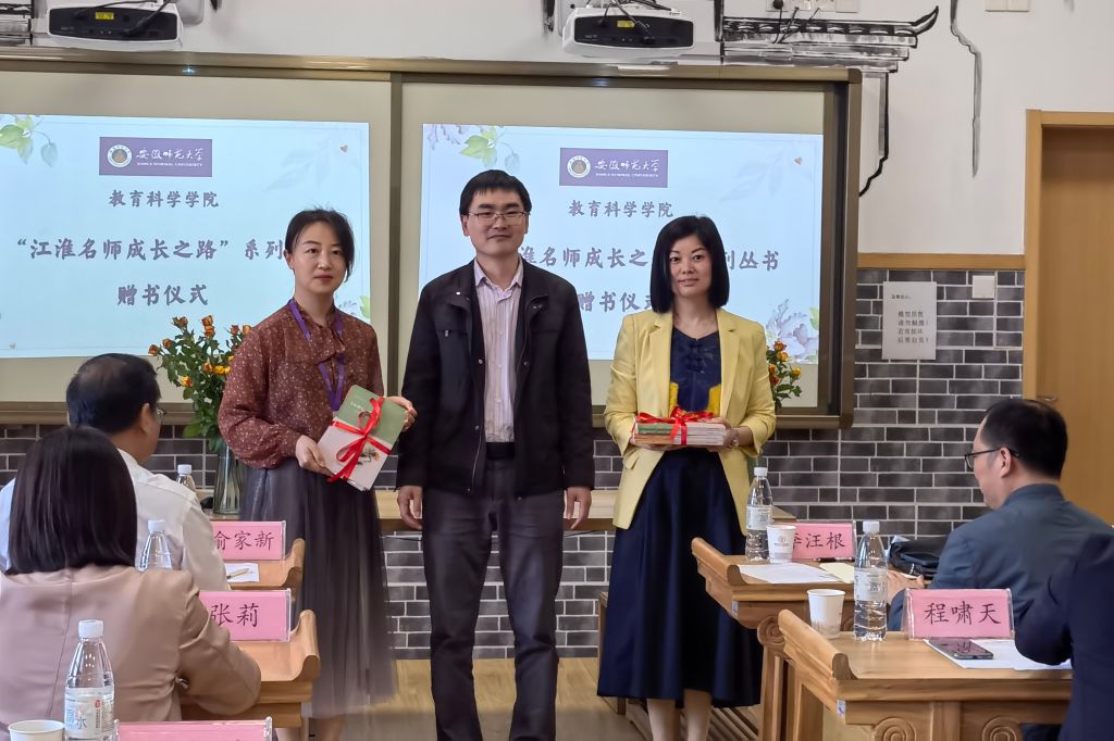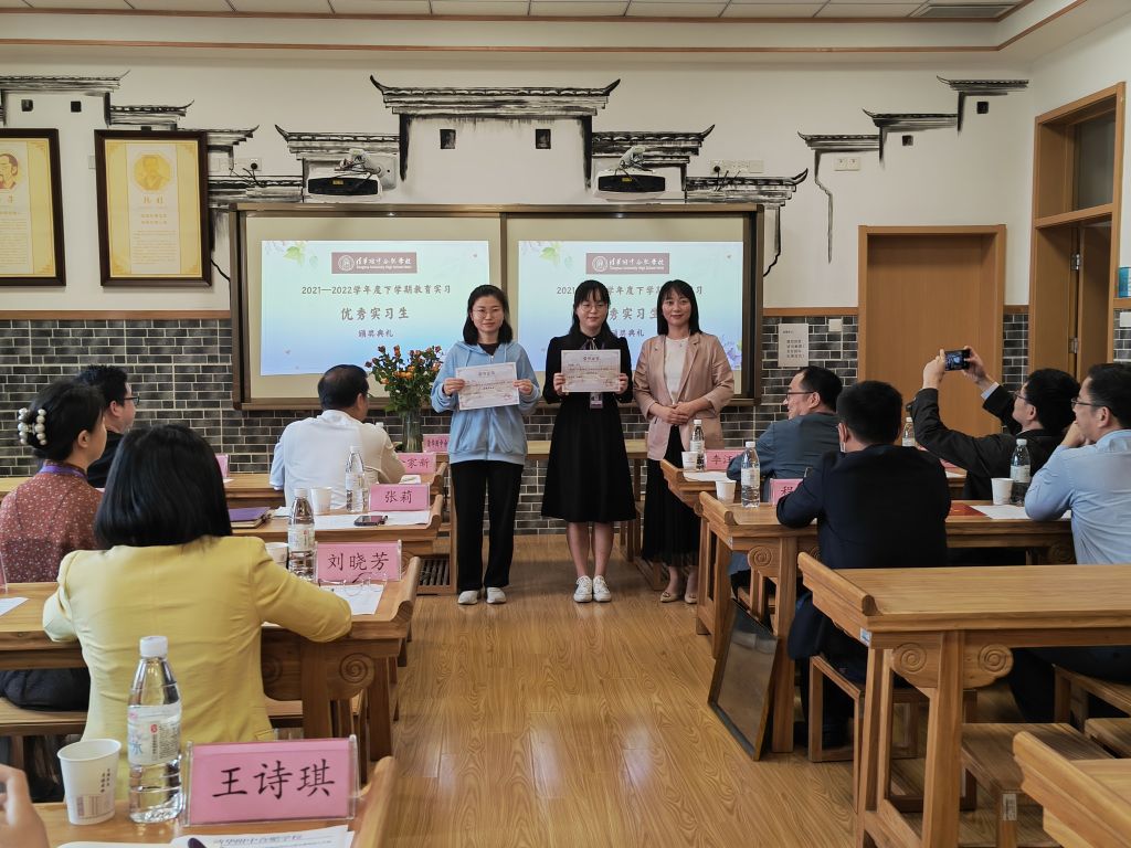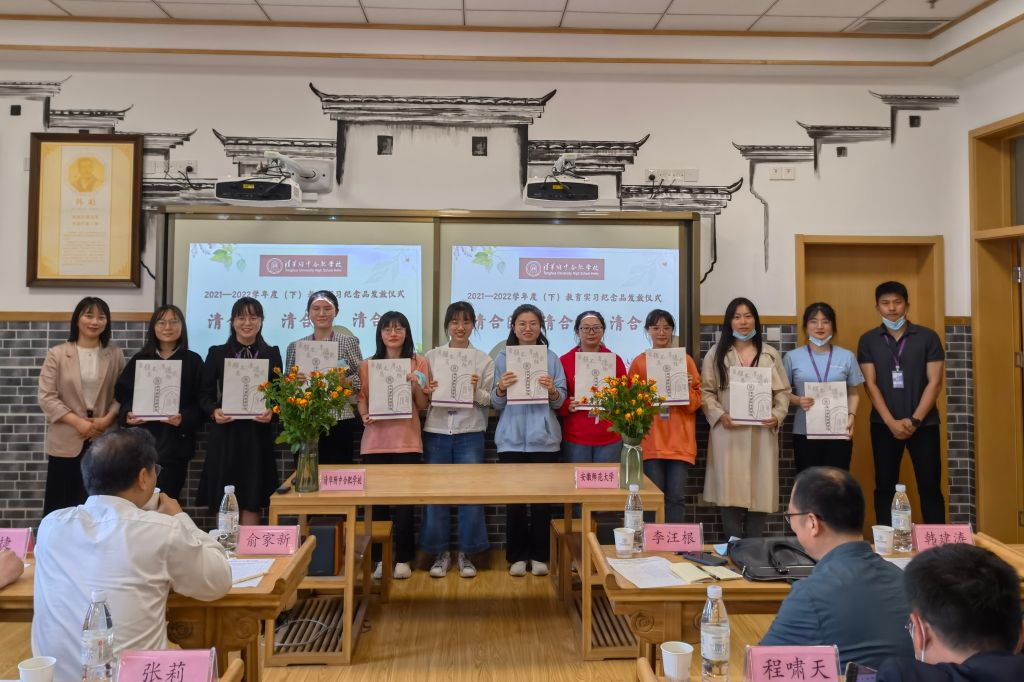 专业与实习基地结合日常表现,秉持着公平公正的原则,评选出李雅馨、邓丽两位同学为优秀实习生,并由小学部部长张莉颁发证书。教科院副经理韩建涛代表公司赠予实践导师“江淮名师成长之路”系列丛书,走进名著,助力清合教师的专业化成长。清华附中合肥公司也为10名实习生准备了纪念品,印有清合校徽的六彩本子、绘本《快乐的诗人李白》以及附有实践老师赠语的明信片等,承载着校园文化,也寄托着对公司实习生的殷切希望。