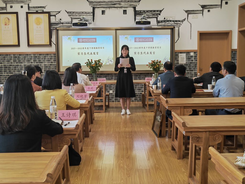 总结会上,教学服务中心召集人王诗琪对教育实习工作进行了小结,她回顾工作的点点滴滴,肯定了10名同学在教育实习过程中的表现。接着,教育学专业负责人徐赟用“祝贺”“感谢”“期待”三个词分别表达了对实习生在疫情背景下完成实习任务的祝贺、对清华附中合肥公司提供实习机会和各项保障工作的感谢,以及公司与实习公司今后合作的期待。随后,李雅馨同学作为实习生代表发言,从教研、教学、班主任工作三方面回顾收获,并对实习公司表达了真切的祝福。
