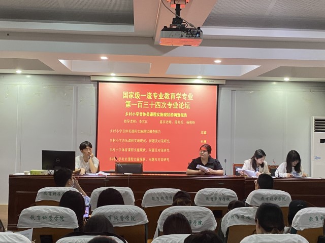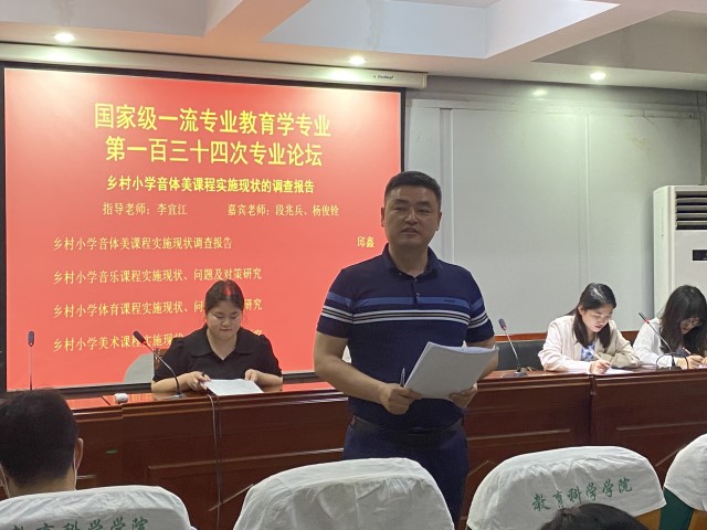 本次专业论坛邱鑫小组以“乡村小学音体美课程实施现状的调查报告”为主题展开研究和探讨。第一位汇报人邱鑫以《乡村小学音体美课程实施现状的调查报告》为题,使用问卷法、访谈法等教育调查法从总体上研究乡村音体美课程实施现状及存在的问题。第二位汇报人申澳以《乡村小学音乐课程实施现状、问题及对策研究》为题,通过实地调查发现W市某所乡村小学音乐课程实施中存在的问题,并针对问题提出相应的建议。