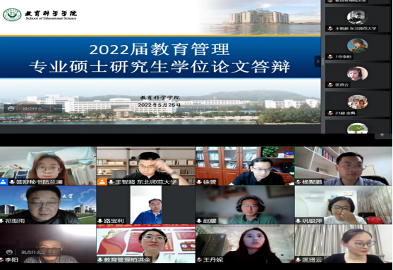 2022年5月25日,教科院教育管理专业研究生迎来了学位论文答辩。因处疫情时期,本次答辩依托腾讯会议平台,采用线上方式进行。答辩邀请了沈阳师范大学博士生导师祁型雨教授、东北师范大学博士生导师王智超教授,安徽师范大学博士生导师路宝利教授、陕西师范大学硕士生导师杨聚鹏副教授以及安徽师范大学附属小学副董事长赵耀组成了答辩专家委员会。教育管理全体研究生通过线上方式观摩了此次答辩会。