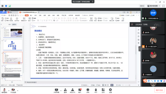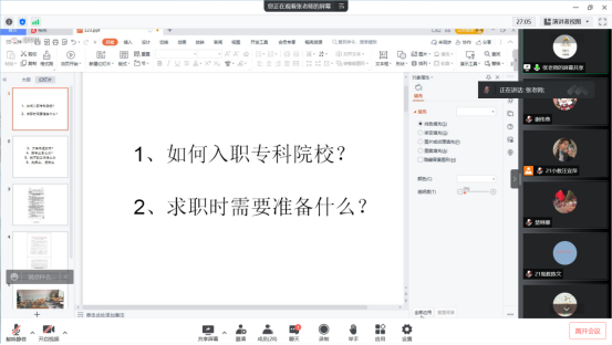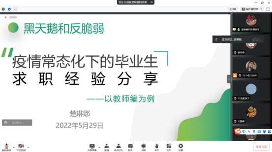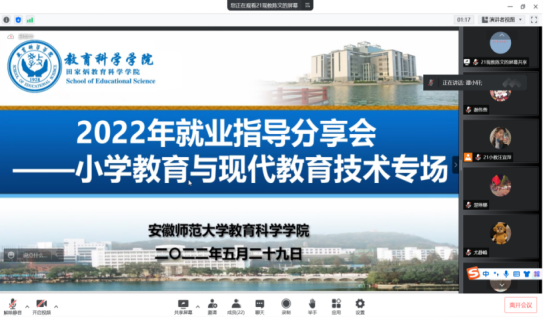 5月29日晚,公司通过腾讯会议平台针对2022届毕业生们开展了小学教育与现代教育技术专场就业指导分享会,研究生辅导员谭茹轩参加了此次会议,近30名硕士研究生在线交流学习,分享会由院研究生会员工部成员汪宜萍主持。