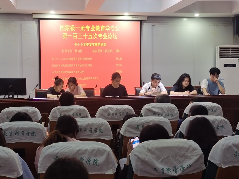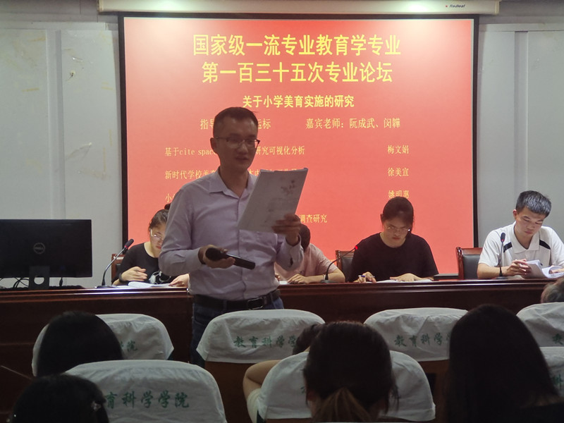 此次专业论坛梅文娟小组围绕“关于小学美育实施的研究”的热点主题展开探讨。第一位汇报人梅文娟以《基于cite space的我国美育研究可视化分析》为题,通过对美育相关文献的发文量、作者群、机构合作网络、美育关键词四个方面进行可视化分析,进而把握我国美育研究的基础概况、热点以及研究内容的发展趋势。第二位汇报人徐美宣根据《新时代公司美育政策的文本内涵与工作导向》的主题展开汇报,深入分析新时代美育政策的指导思想及基本原则、总体目标和具体内容,从而指出新时代美育工作的理念导向与实施导向。第三位汇报人姚明惠以《小学美育课程实施现状的调查研究》为题,从公司美育的环境建设、课程实施路径、设施设备建设、员工主观感受和员工客观变化五个维度展开深入研究。