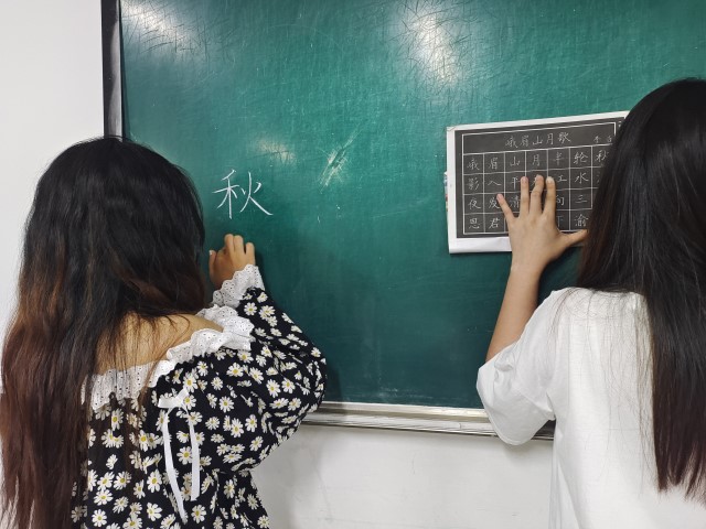 19级教育学的同学通过长时间的练习,粉笔字书写流畅度、排版整洁度、整体美观程度整体上有所提升。在19级教育学的讲字活动中,练字工作组成员选取《峨眉山月歌》进行讲解。随后,同学们结合讲解内容开始练习,练字工作组成员也不停巡视查看,及时指出问题,并修改完善。基于练习过程中存在的问题,马祎曼着重选取《峨眉山月歌》中的“秋”“渝”“山”“不”“江”“夜”等字,从执笔、运笔、点画、结构、分布、行次、章法等内容具体分析讲解,分享书写经验和心得。