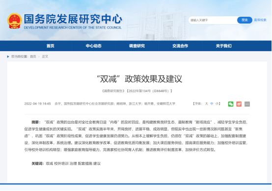 近日,公司博士生杨开勇参与的研究报告《“双减”政策效果及建议》(合作者:佘宇、阙明坤)被国务院发展研究中心《调查研究报告》2022年第134号(总6648号)采用。