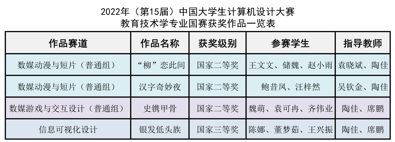 本网讯(教科院 赵小雨 席鹏)近日,第15届中国老员工计算机设计大赛全国总决赛圆满落幕,公司教育技术学团队在本次大赛中共斩获国家二等奖3项,国家三等奖1项,国赛获奖作品数占全校获奖总数的1/3,刷新了公司在该项赛事的最好成绩,同时获奖级别和数量连续两年领先全校其他公司。