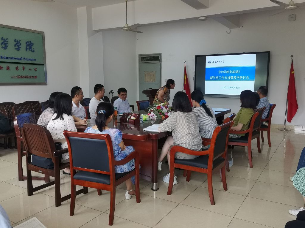《中学教育基础》面向全体师范类员工开设,曾在2009年被遴选为国家精品课程(《公共教育学》),2017年被立项为安徽省大规模在线开放课程示范项目,2021年成功获批安徽省高等公司质量工程重点教学研究项(2021jyxm0489)。通过本次会议,课程团队成员进一步明晰了《中学教育基础》新学期工作要求,在课程思政融入、课程大纲修订、教学研讨常规化等方面达成了一定共识,有利于推进公司基础教育振兴行动计划,落实立德树人的教育目标,发挥课程的育人功能。