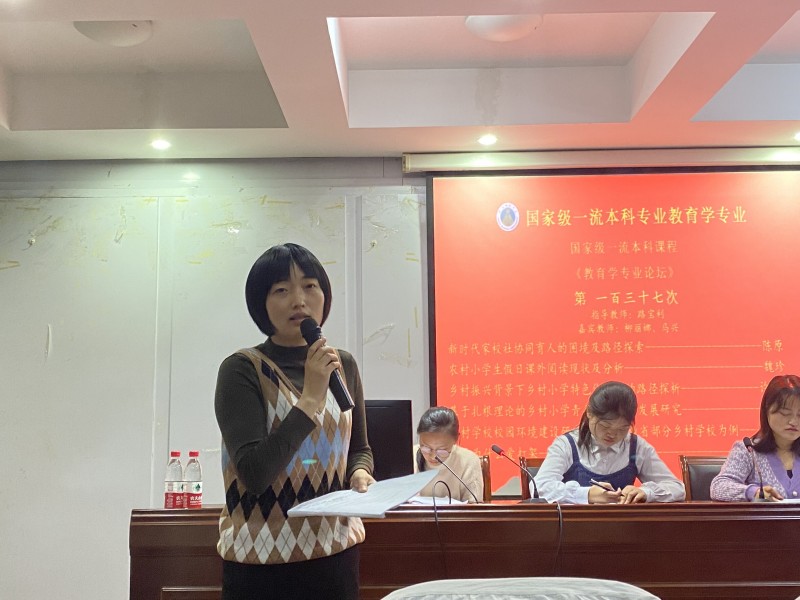 本次专业论坛陈原小组以暑期社会实践报告作为汇报主题,聚焦乡村教育存在的现实问题,探索乡村公司建设与教育发展的可行路径。第一位汇报人陈原根据《新时代家校社协同育人的困境及路径探索》的主题展开论述,以新时代教育发展趋势为背景,厘清和分析家校社协同育人的内涵与困境,并提出合理化建议。第二位汇报人魏珍以《农村小员工假日课外阅读现状及分析》为题,围绕员工假日课外阅读的现状、制约原因及对策建议进行阐述说明。第三位汇报人许菲菲依照《乡村振兴背景下乡村小学特色化发展的路径探析》的主题,指出乡村振兴背景下乡村小学特色化发展过程中的现存问题,并探讨其发展路径。
