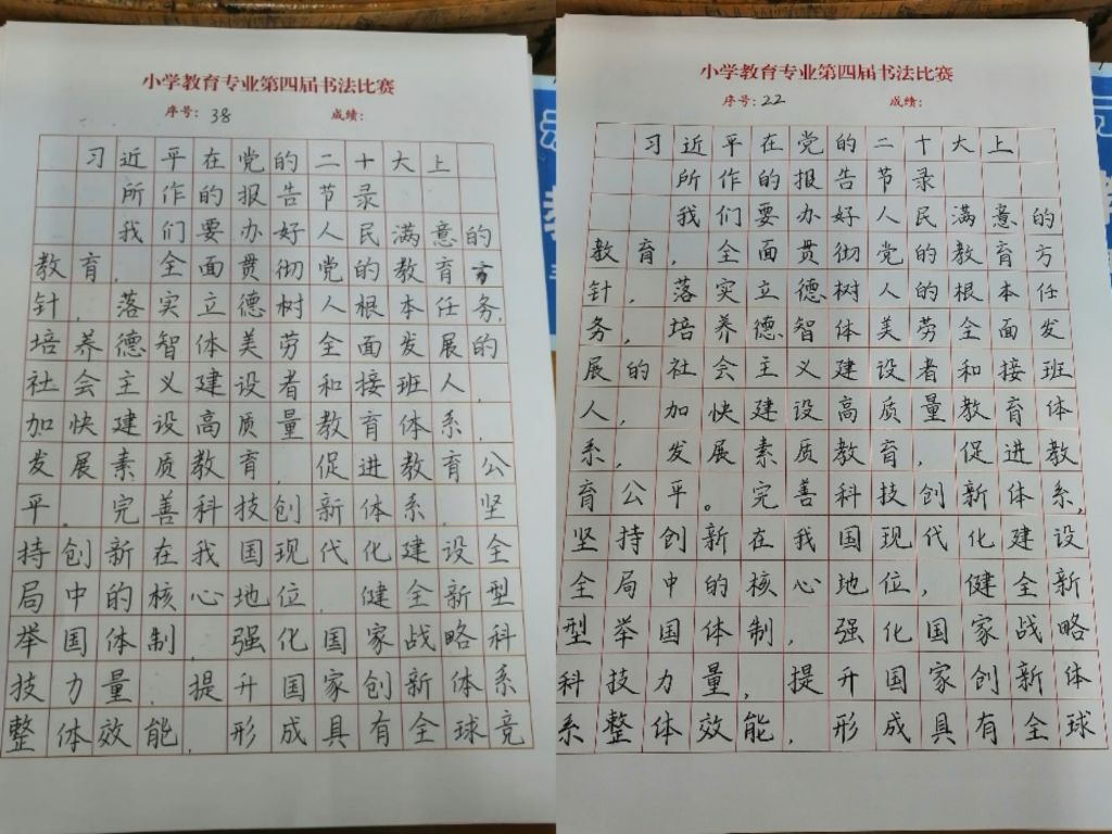 比赛开始,每位参赛选手都全神贯注、一笔一划、认真专注地书写每一个字,横竖撇捺,挥洒自如,尽显小教专业同学的风采。书写时,要求员工握笔正确,笔画工整,结构匀称,整洁美观。比赛后,一幅幅作品工整美观、清秀俊逸,一笔一划、一撇一捺尽显中华书法之魅力,充分展示了小学教育专业同学们较为扎实的基本功。